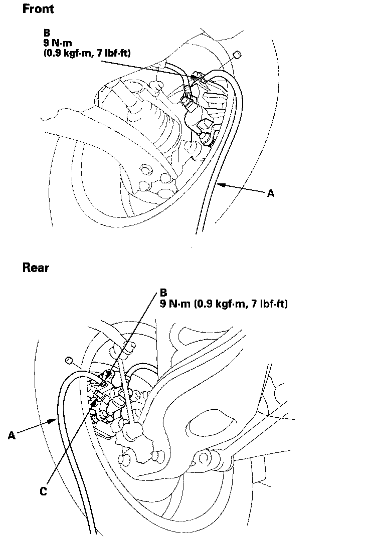 NOTE: Do not loosen the special bolt (C) on the rear caliper.