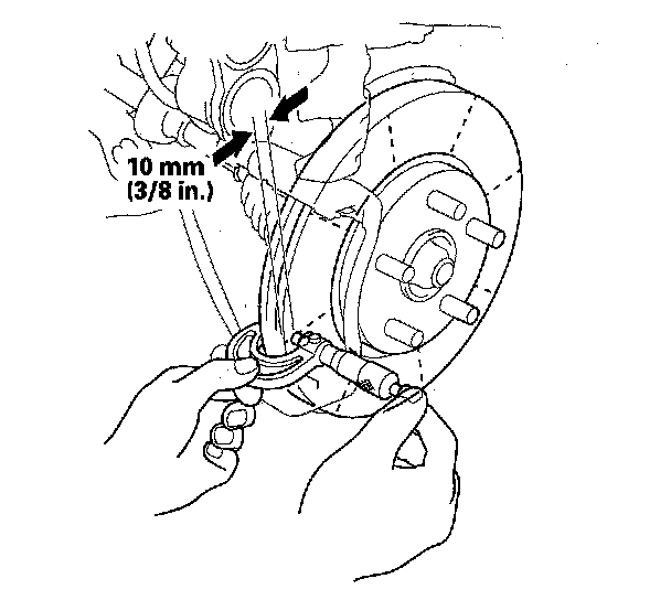 6. Set up the dial gauge against the brake disc as shown, and measure the runout at 10 mm (3/8 in.) from the outer edge of the brake disc.