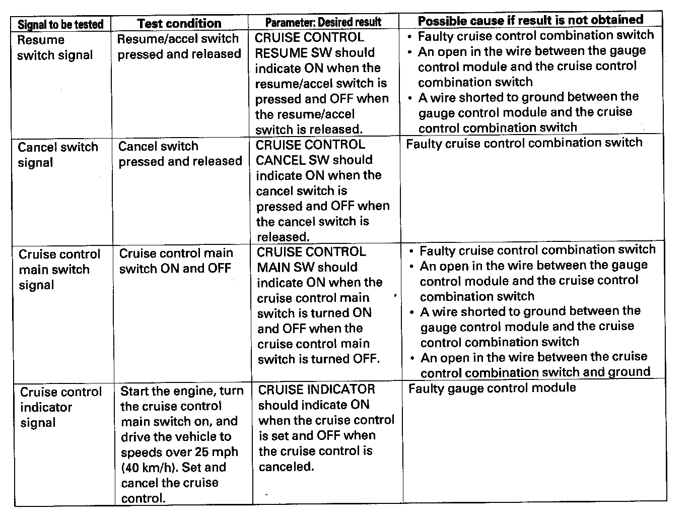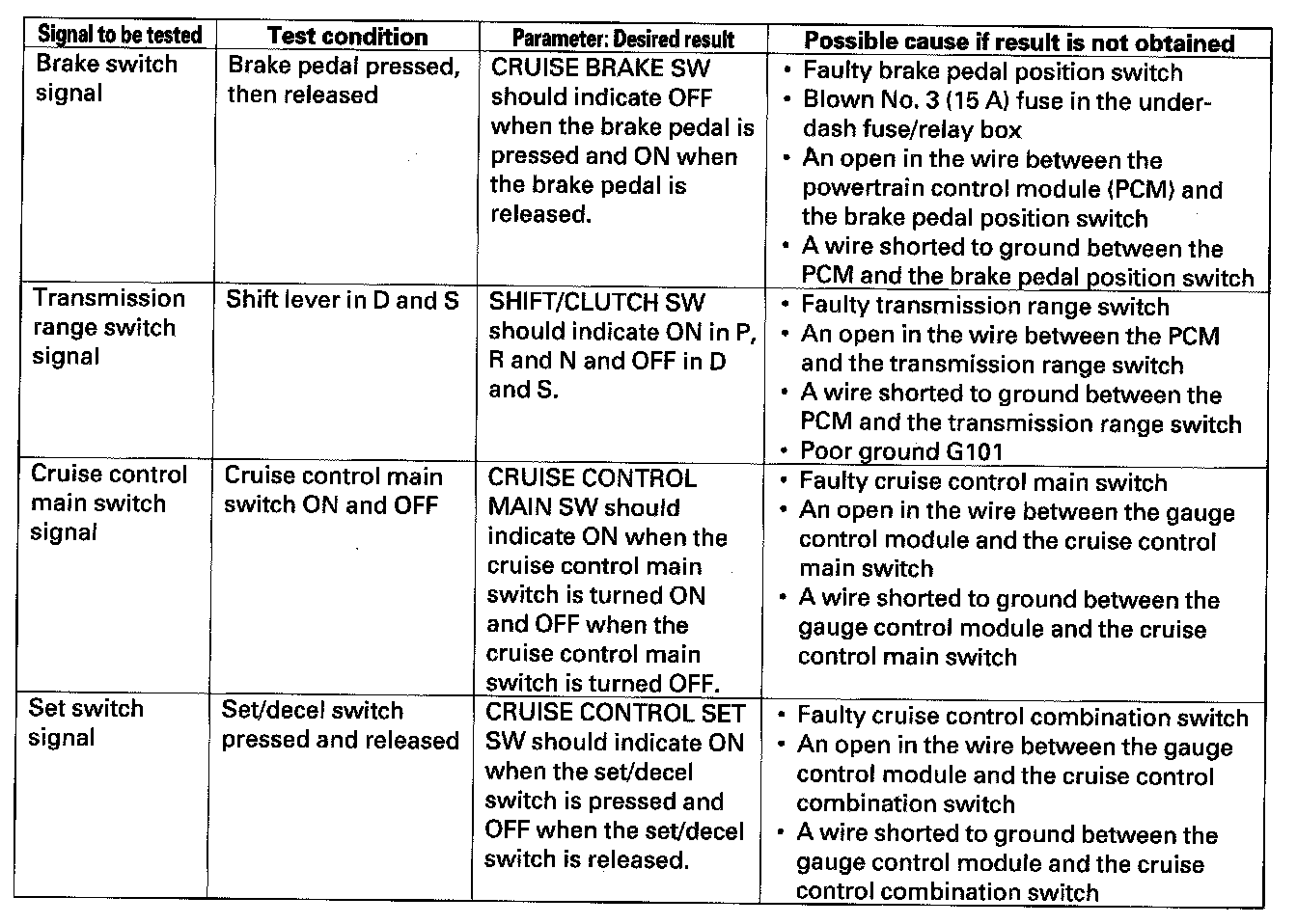 NOTE: Intermittent failures are often caused by loose circuit connections. While monitoring cruise control inputs, flex their circuits, and note if any of the test results change.