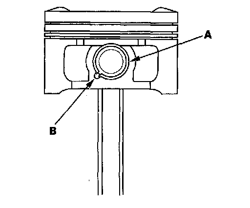 2. Apply new engine oil to the piston pin snap rings (A), and turn them in the ring grooves until the end gaps are lined up with the cutouts in the piston pin bores (B).