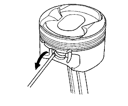 3. Remove both snap rings. Start at the cutout in the piston pin bore. Remove the snap rings carefully so they do not go flying or get lost. Wear eye protection.