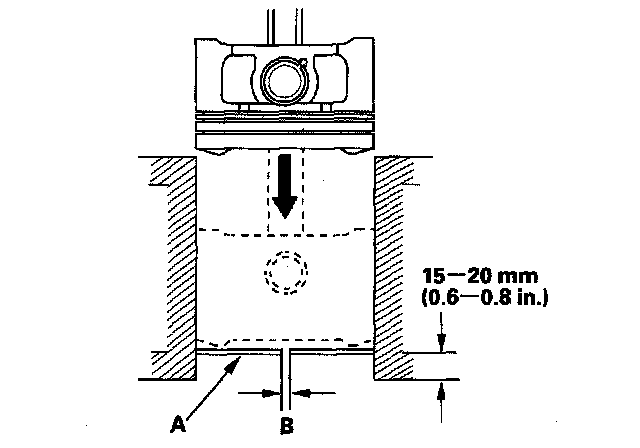 4. Using a piston that has its rings removed, push a new ring (A) into the cylinder bore 15-20 mm (0.6-0.8 in.) from the bottom.