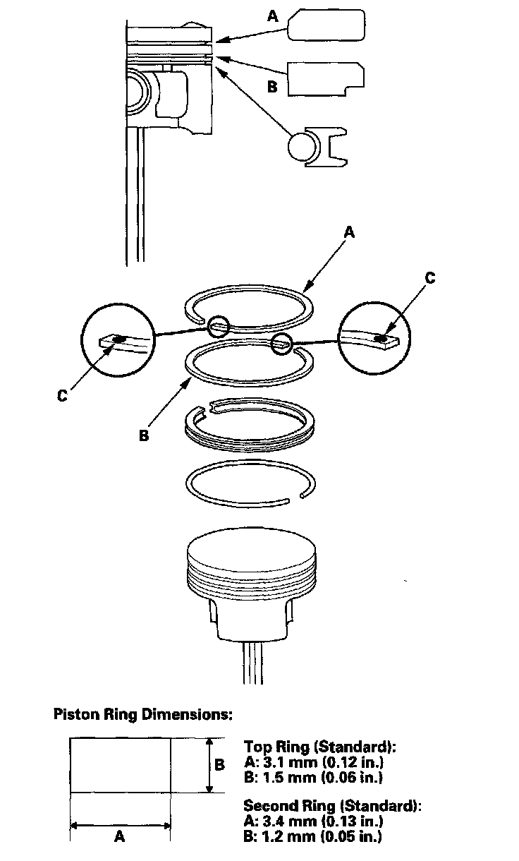 The top ring groove is 1.5 mm (0.06 in.) wide. The 2nd ring groove is 1.2 mm (0.05 in.) wide. The oil ring groove is 2.0 mm (0.08 in.) wide.