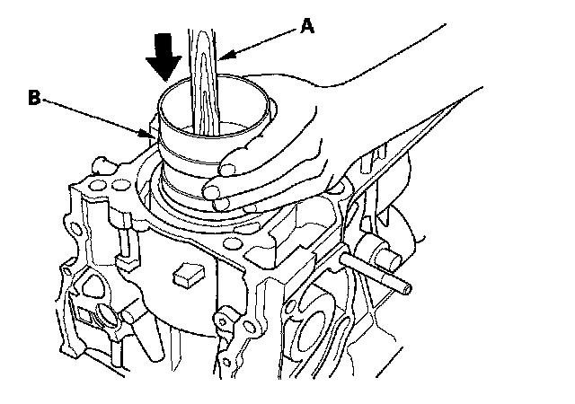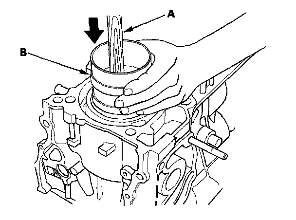 4. Position the piston in the cylinder, and tap it in using the wooden handle of a hammer (A). Push down on the ring compressor (B) to prevent the rings from expanding before entering the cylinder bore.