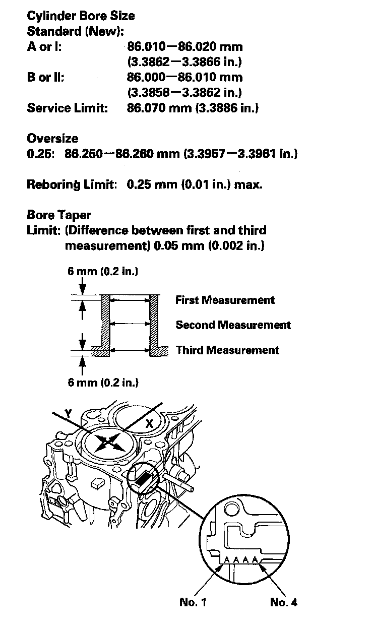 4. Measure the wear and taper in direction X and Y at three levels in each cylinder as shown. If the measurements in any cylinder are beyond the Oversize Bore Service Limit, replace the block. If the block is being rebored, refer to step 7 after reboring.