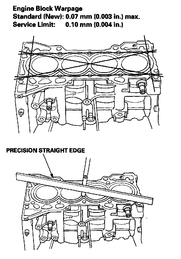 6. Check the top of the block for warpage. Measure along the edges, and across the center as shown.