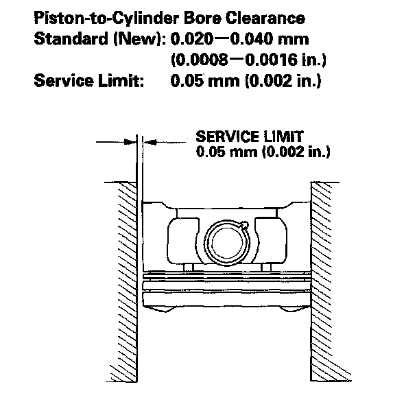 7. Calculate the difference between the cylinder bore diameter and the piston diameter. If the clearance is near or exceeds the service limit, inspect the piston and cylinder bore for excessive wear.
