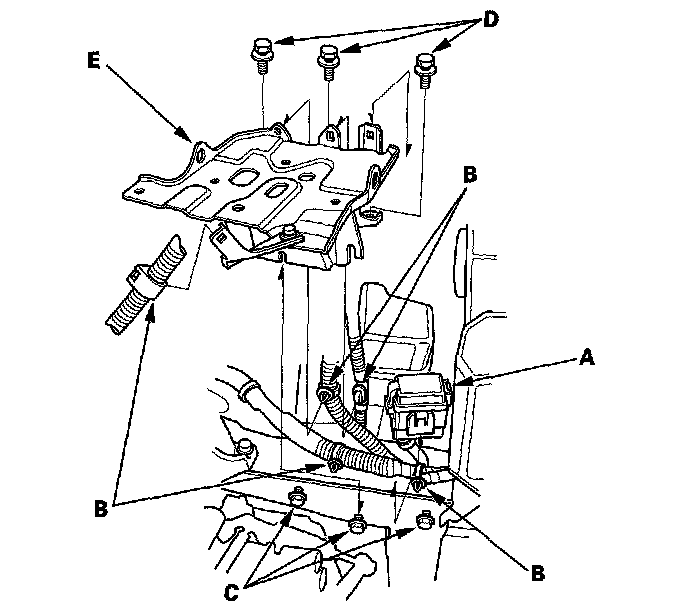 8. Loosen the bolts (C), and remove the bolts (D), then remove the battery base (E).