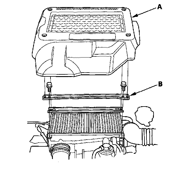 9. Remove the charge air cooler cover (A), then remove the charge air cooler cover front bracket (B).