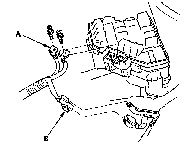 11. Remove the battery cables (A) from the under-hood fuse/relay box.