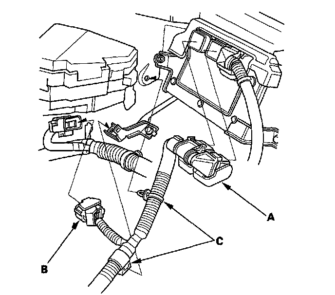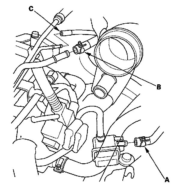 18. Remove the evaporative emission (EVAP) canister hose (A), brake booster vacuum hose (B), and vacuum hose (C).