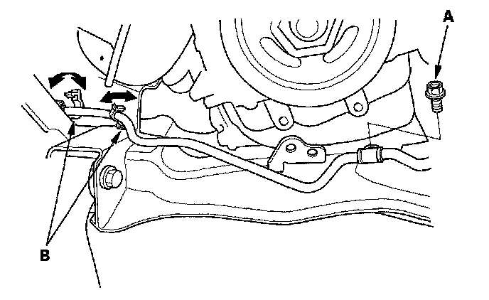 34. Remove the bolt (A) securing the P/S fluid line bracket, and unclamp the P/S fluid line clamps (B) on the front subframe.