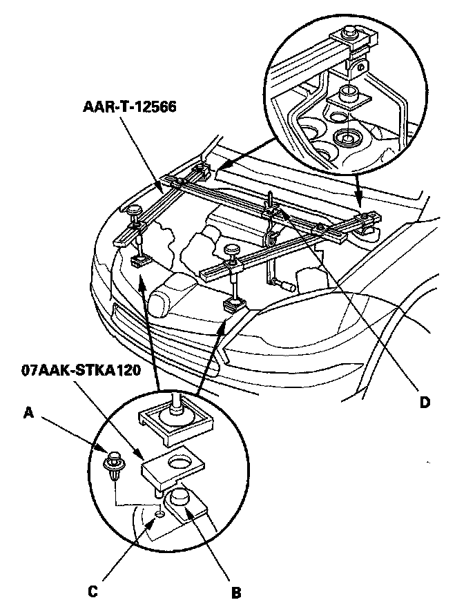 43. Remove the top corner clip (A) from the front grill on both sides. Place the engine support mount pads over the hood edge cushions (B), and align the pins with the clip hole (C). Remove the lids from both side of the cowl cover. Install the engine support hanger (AAR-T-12566), then attach the hook to the engine support eyelet. Tighten the wing nut (D) by hand to lift and support the engine/transmission assembly.
