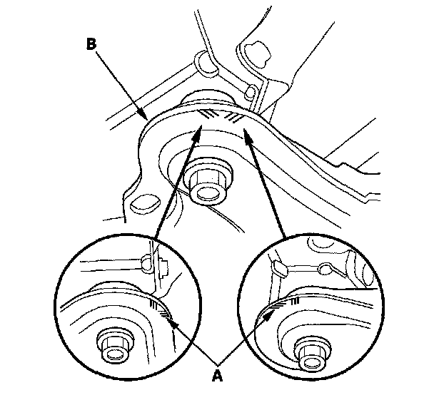 46. Make reference marks on the body across the marks (A) on the edge of the front subframe (B).