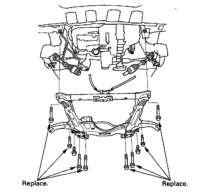 58. Slowly lower the engine/transmission assembly about 150 mm (6 in.). Check once again that all hoses and electrical wiring are disconnected and free from the engine/transmission, then lower it all the way.