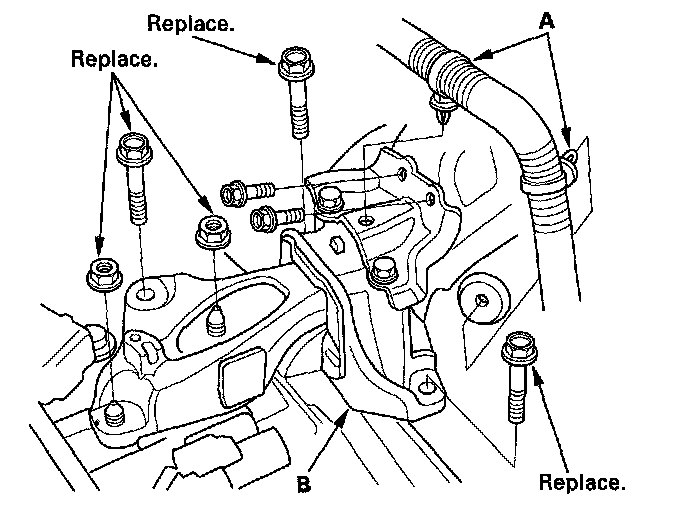 52. Remove the harness clamps (A), then remove the transmission mount (B).