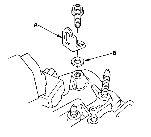 53. Install the transmission hanger bracket (P/N 21232-RCT-A00) (A) and washer (B) on the transmission.