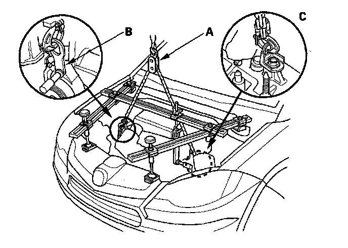 55. Attach a chain hoist (A) to the universal eyelet (B), and the transmission hook (C). Lift up on the engine/transmission assembly until it's securely supported by the chain hoist, and remove the engine hanger.