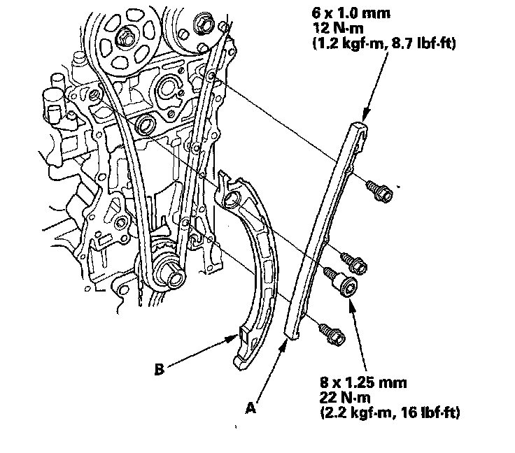 7. Install the cam chain guide A and tensioner arm (B).