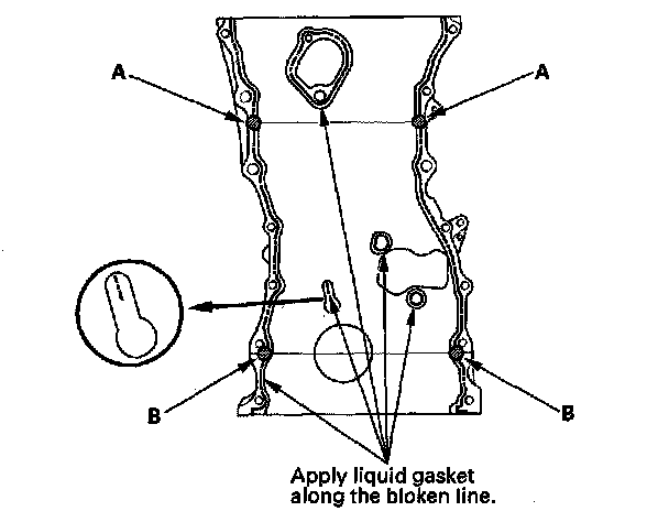 16. Apply liquid gasket to the engine block upper surface contact areas (A) on the chain case and lower block upper surface contact areas (B) on the chain case.