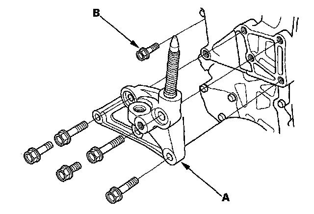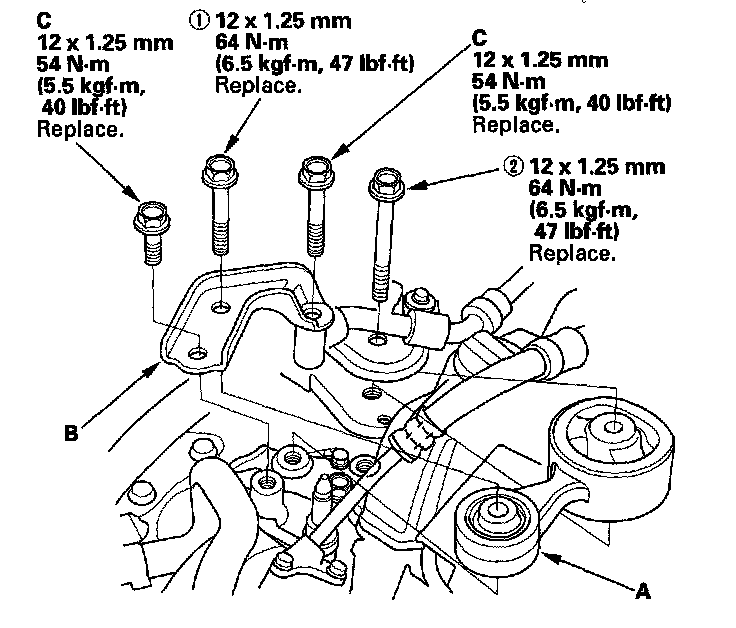 20. Install the side engine mount bracket (A), then loosely tighten the new bolt and nut (B), and loosely tighten the bolt (C).