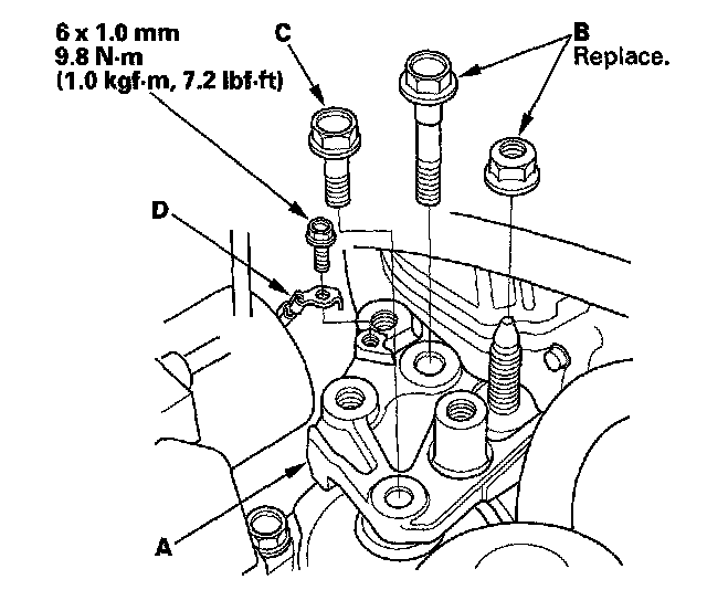 18. Install the new O-ring (A) on the chain case. Set the edge of the chain case (B) to the edge of the oil pan (C), then install the chain case on the engine block (D). Wipe off the excess liquid gasket on the oil pan and chain case mating area.