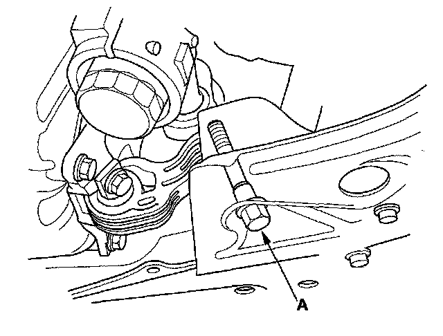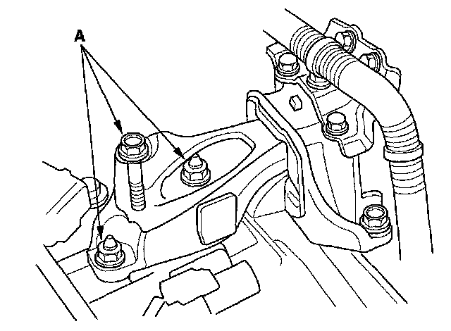 23. Loosen the transmission mounting bolt and nuts (A).