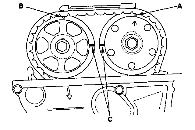 6. Set the No. 1 piston at top dead center (TDC). The punch mark (A) on the variable valve timing control (VTC) actuator and the punch mark (B) on the exhaust camshaft sprocket should be at the top. Align the TDC marks (C) on the VTC actuator and exhaust, camshaft sprocket.