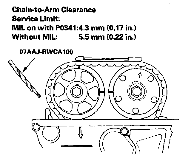 7. Measure the clearance between the cam chain and the tensioner arm with the cam chain inspection gauge.