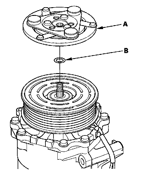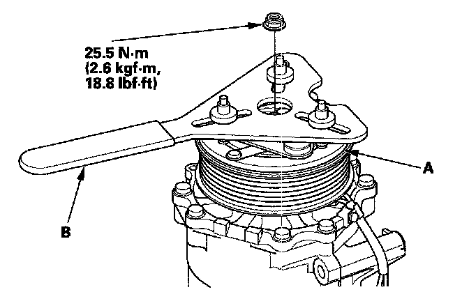 1. Remove the center nut while holding the armature plate (A) with a commercially available A/C clutch holder (B).
