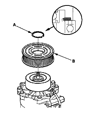 3. If you are replacing the field coil, remove the snap ring (A) with snap ring pliers, then remove the rotor pulley (B). Be careful not to damage the rotor pulley and A/C compressor.