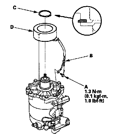4. Remove the bolt (A), then disconnect the field coil connector (B). Remove the snap ring (C) with snap ring pliers, then remove the field coil (D). Be careful not to damage the field coil and A/C compressor.