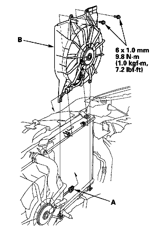 5. Disconnect the connector (A) from the A/C condenser fan motor. Then remove the upper mounting bolts, and the A/C condenser fan shroud (B). Be careful not to damage the radiator fins when removing the A/C condenser fan shroud.