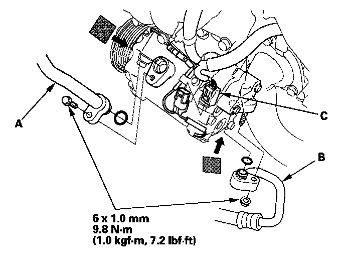 6. Remove the bolt and the nut, then disconnect the suction hose (A), discharge hose (B) and connector (C) from the A/C compressor. After the hoses are disconnected, remove the O-rings and plug or cap the lines immediately after disconnecting them to avoid moisture and dust contamination.