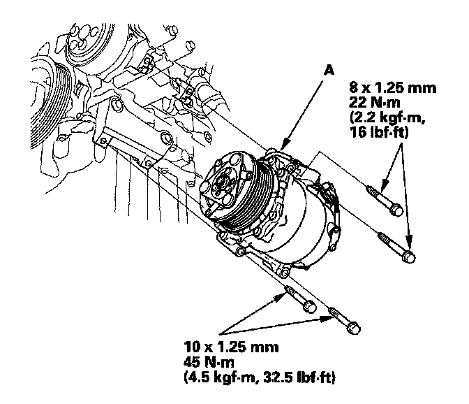 7. Remove the mounting bolts and the A/C compressor (A). Be careful not to damage the radiator fins when removing the A/C compressor.
