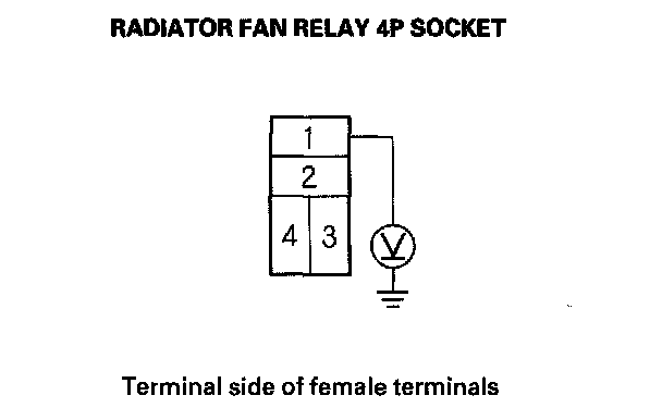 3. Measure the voltage between radiator fan relay 4P socket terminal No. 1 and body ground.