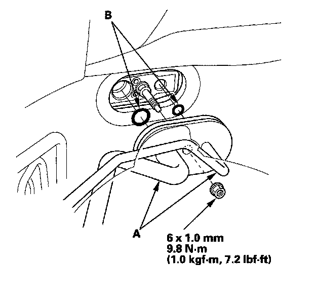 3. Remove the nut, then disconnect the A/C lines (A) and remove the O-rings (B) from the evaporator core.