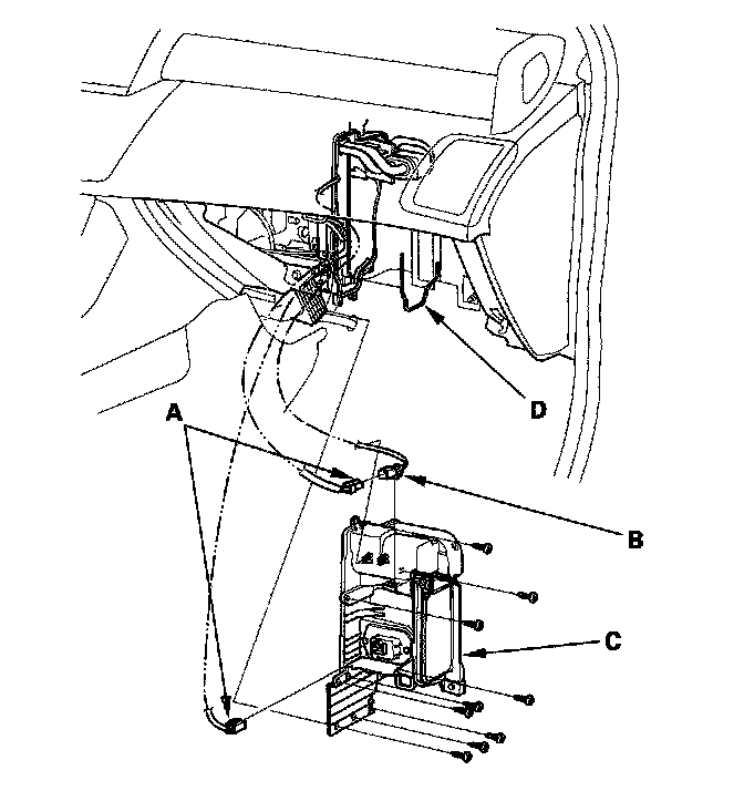 6. Disconnect the connectors (A) from the evaporator temperature sensor and the power transistor, then remove the connector clip (B). Remove the self-tapping screws, the expansion valve cover (C), and the seal (D).