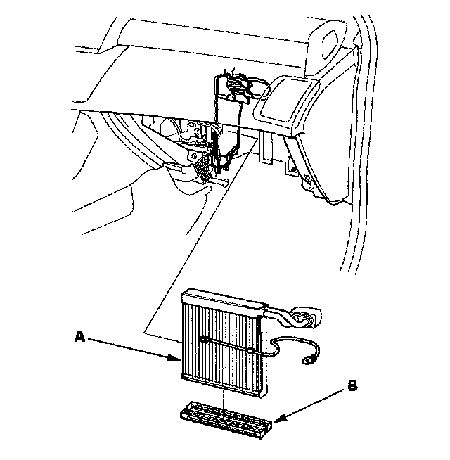 7. Carefully pull out the evaporator core (A) without bending the lines, then remove the plate (B).