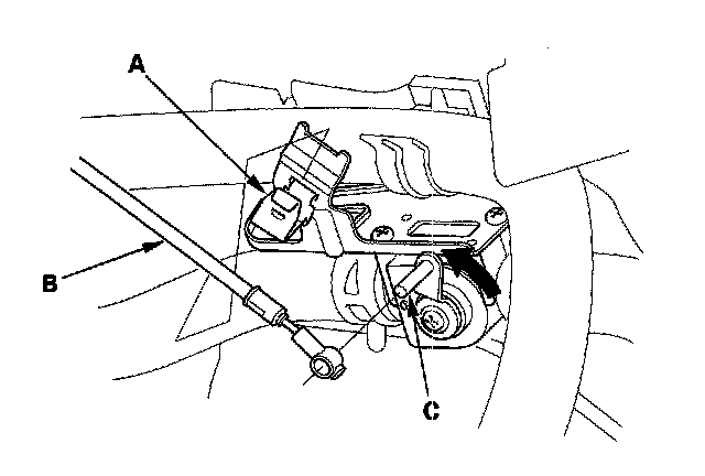 Heater Valve Cable Adjustment1. From under the hood, open the cable clamp (A), then disconnect the heater valve cable (B) from the heater valve arm (C).