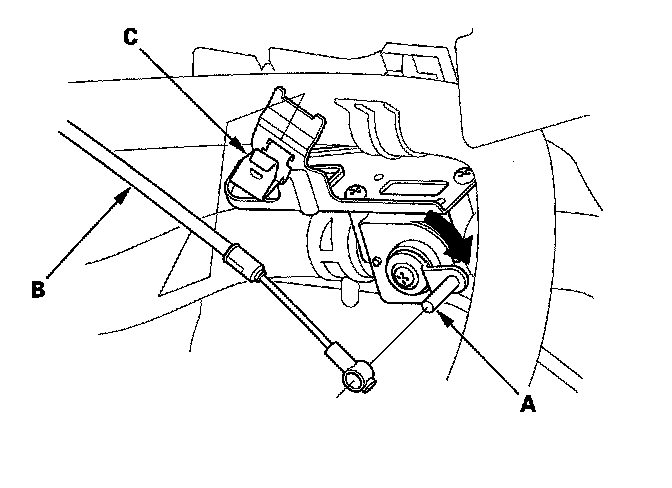 5. From under the hood, turn the heater valve arm (A) to the fully closed position as shown, and hold it. Attach the heater valve cable (B) to the heater valve arm, and gently pull on the heater valve cable housing to take up any slack, then install the heater valve cable housing into the cable clamp (C).