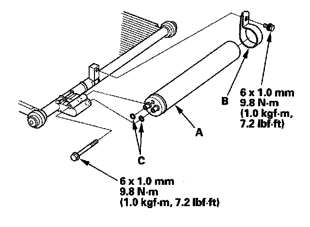 2. Remove the bolts from the A/C condenser, then remove the receiver/dryer (A), the bracket (B), and the O-rings (C).