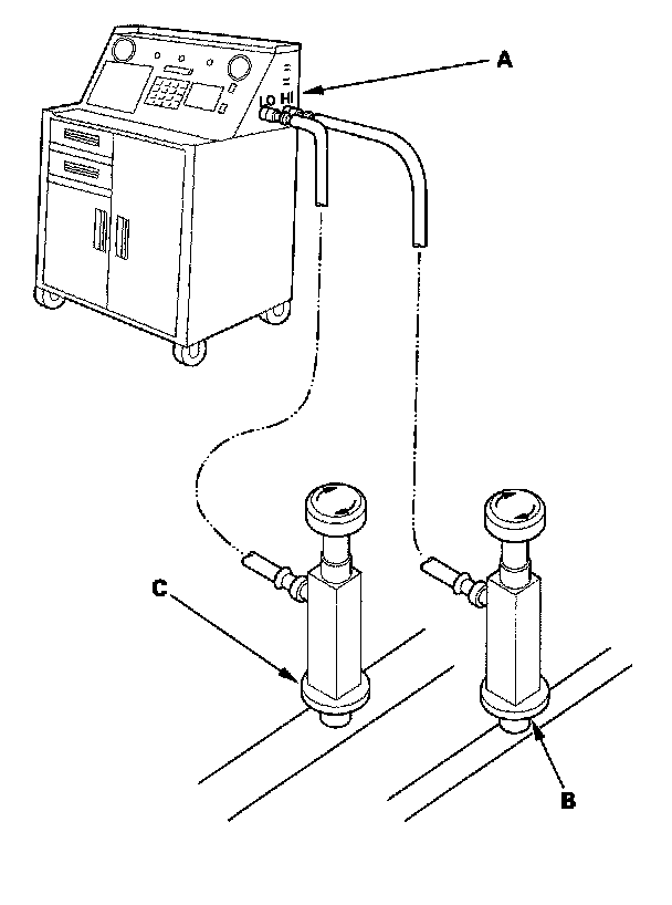 2. Connect an R-134a refrigerant recovery/recycling/charging station (A) to the high-pressure service port (B) and the low-pressure service port (C), as shown, in the equipment manufacturer's instructions. Evacuate the system.
