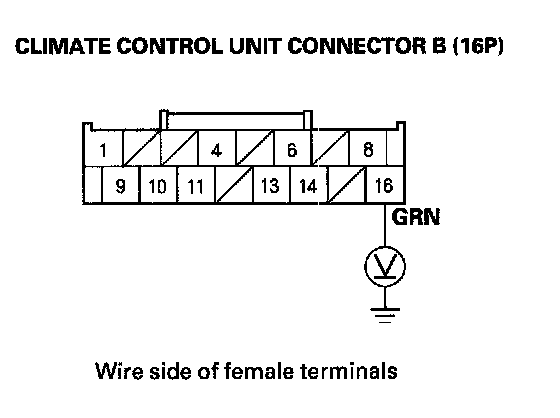 4. Measure the voltage between the climate control unit connector B (16P) terminal No. 16 and body ground.
