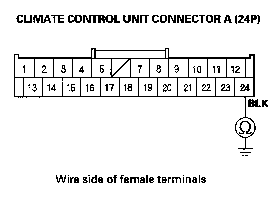 6. Check for continuity between the climate control unit connector A (24P) terminal No. 24 and body ground.