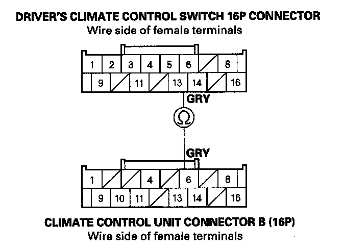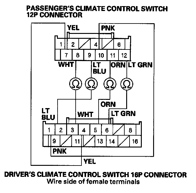 9. Check for continuity between passenger's climate control switch 12P connector and the driver's climate control switch 16P connector as shown.