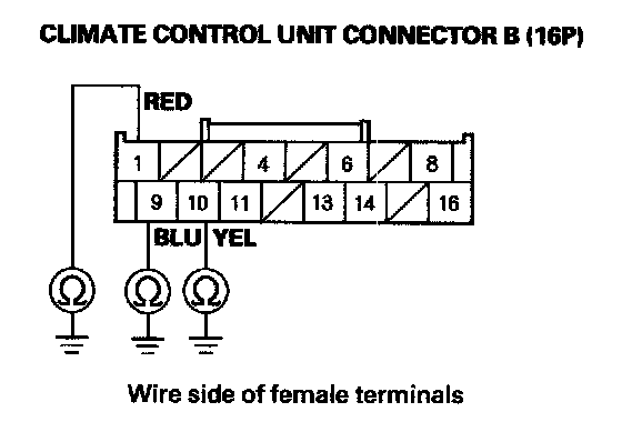 7. Check for continuity between body ground and the climate control unit connector B (16P) terminals No. 1,9, and No. 10 individually.