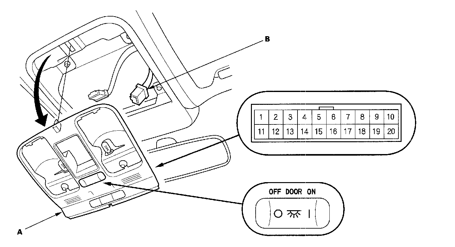 4. Disconnect the 20P connector (B) from the roof console.