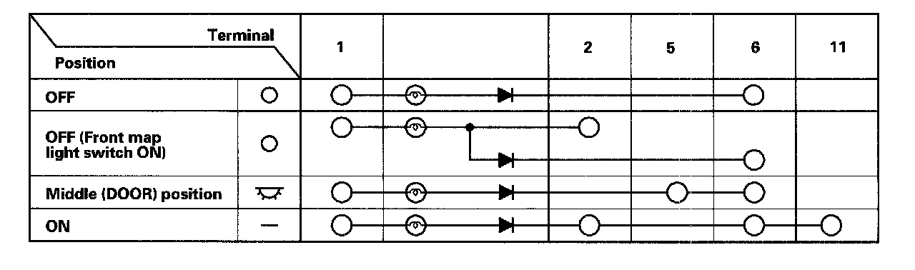5. Check for continuity between the terminals in each interior light switch position according to the table.