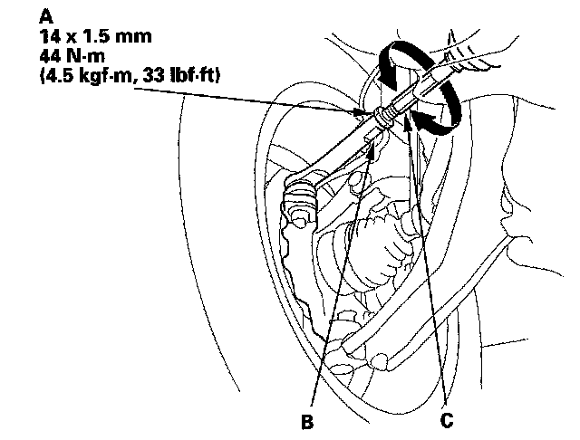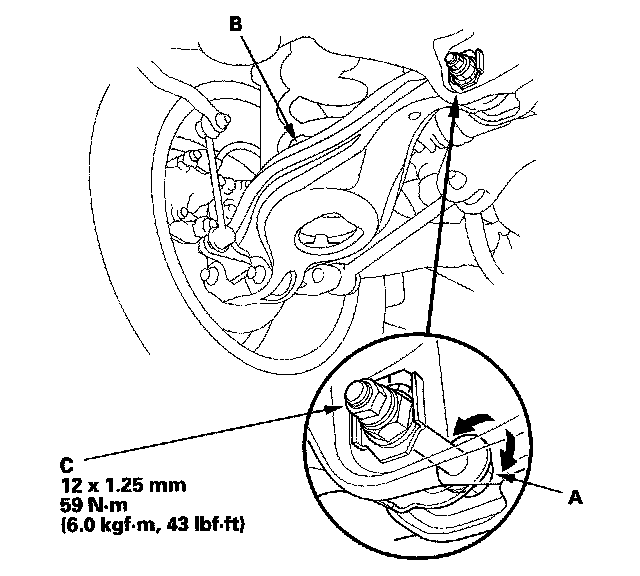 3. Hold the adjusting bolt (A) on lower arm B, and remove the self-locking nut (C).